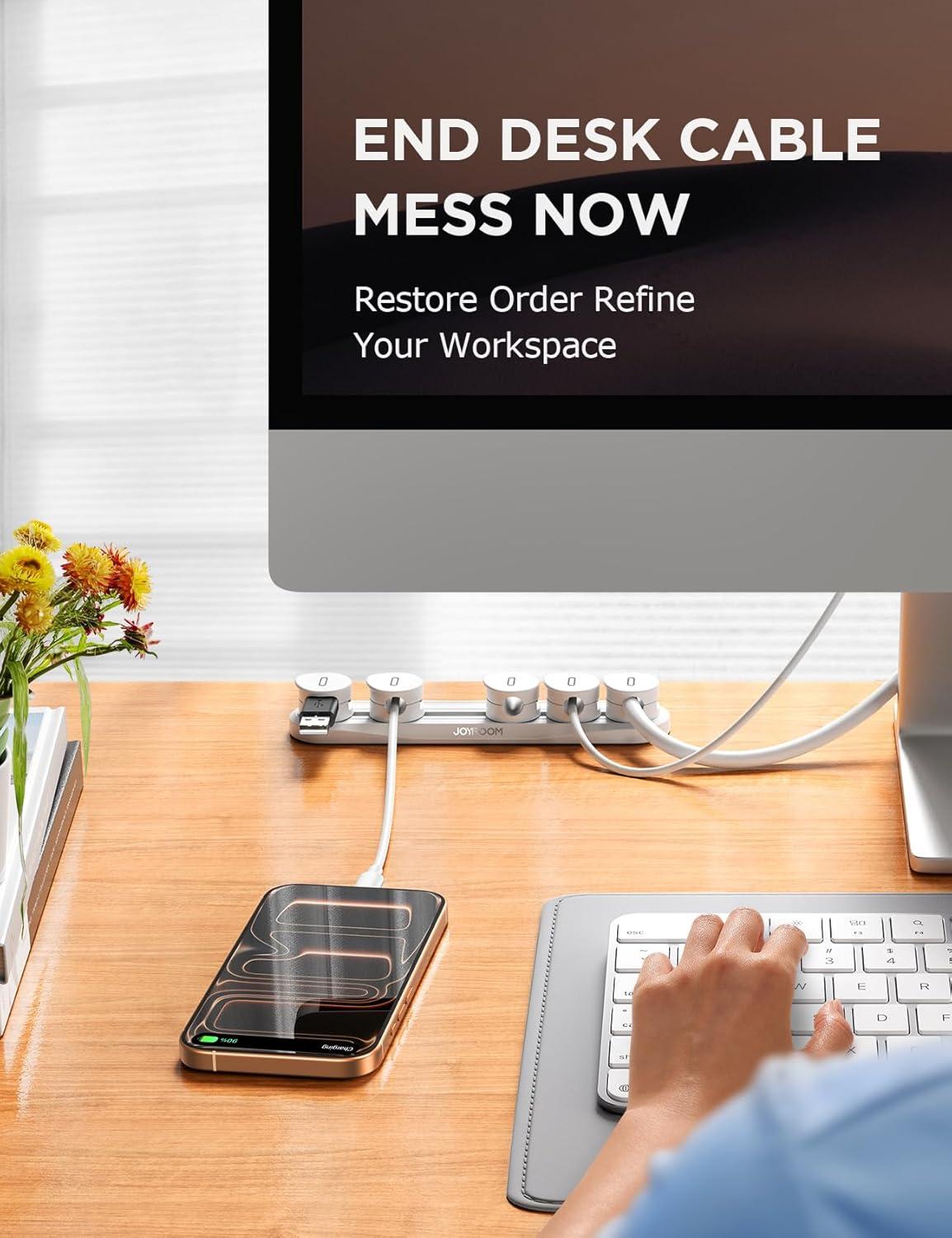JOYROOM 5-in-1 Magnetic Cable Management: Engineered with advanced N50 magnetic clasps, JOYROOM magnetic cable clips secure cables precisely without tangles. The unified sliding track organizes more than five cords simultaneously, eliminating clutter with permanent cord management. Achieve a streamlined workspace with effortless access to charging cables, wired earbuds, and peripherals.