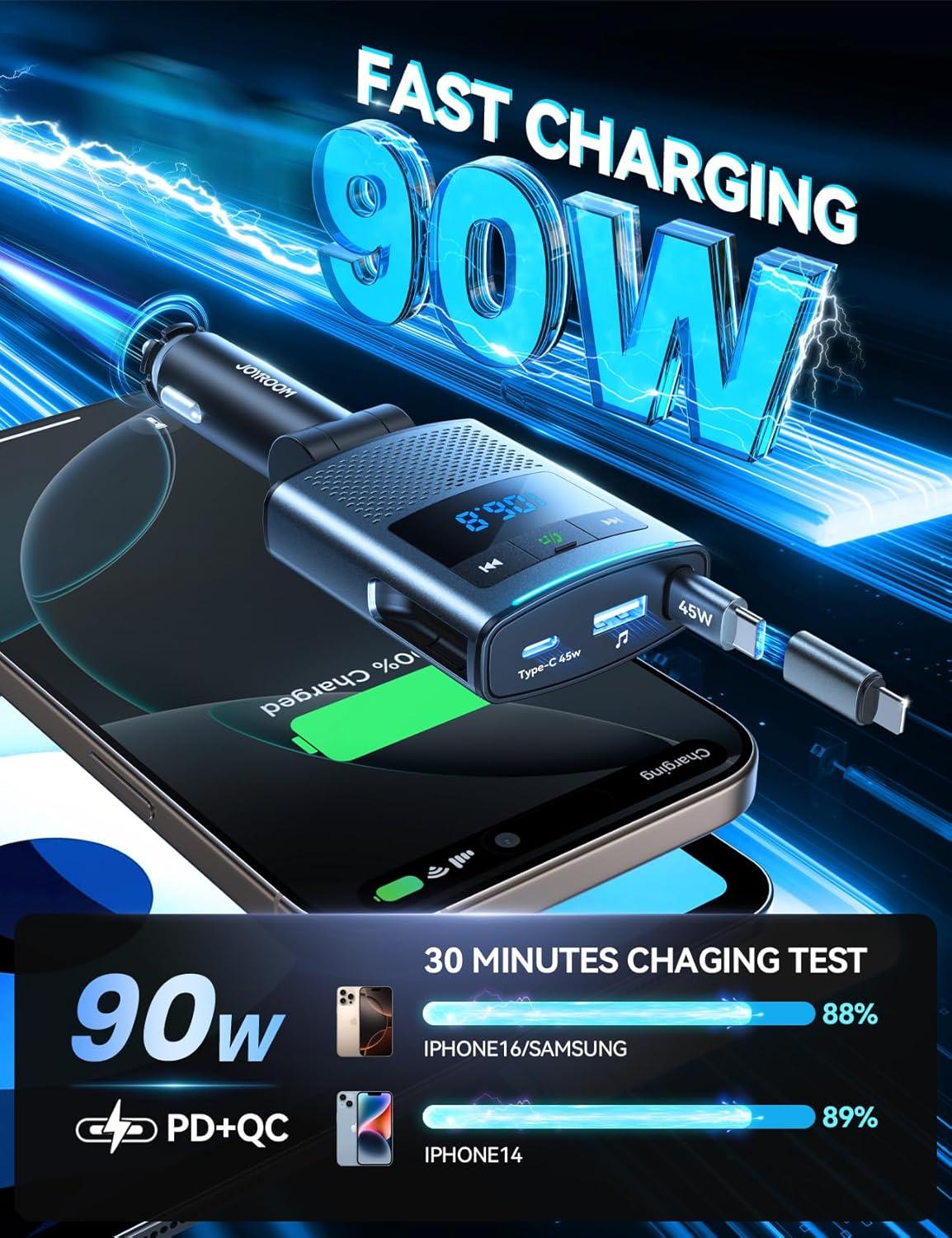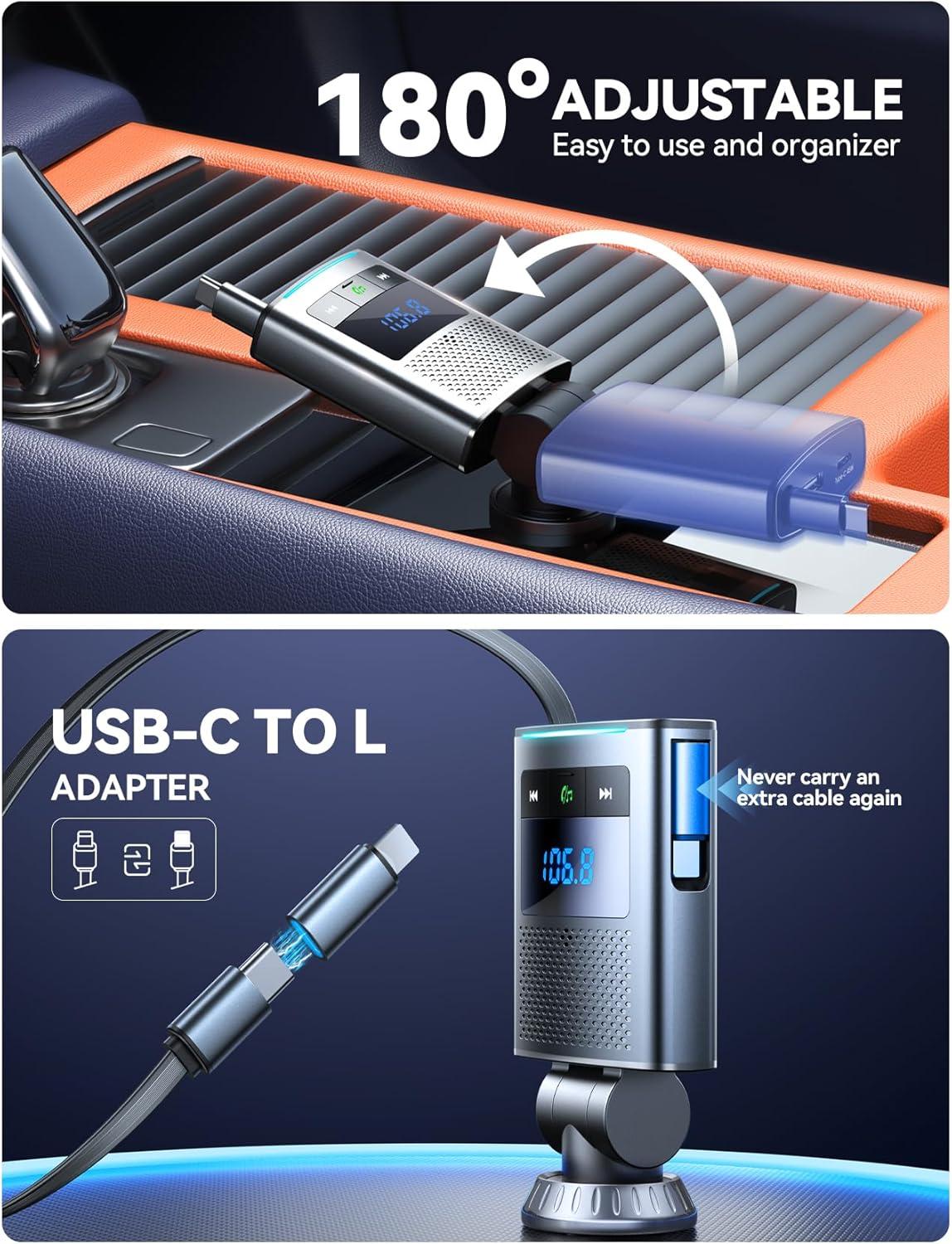 90W Fast Charger Car Bluetooth: This FM transmitter car Bluetooth is equipped with a 45W PD&QC3.0 charging port and 45W retractable USB-C cables, which can fast charge two devices at the same time and is compatible with Samsung/iPhone/Xiaomi /Google and other fast loading protocols. Also includes a USB-C Female for L Male Adapter