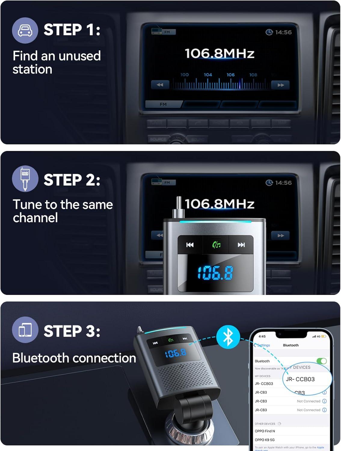 Safer & Widely Used: JOYROOM Bluetooth FM transmitter is equipped with multiple protections such as over-current, over-voltage, over-heat, and short-circuit, ensuring safe charging while driving! The frequency range is between 88.1MHz-107.9MHz. After booting, it will automatically connect to the saved Bluetooth device. Compatible with 12V-24V cigarette lighter sockets and 99% of all smartphones