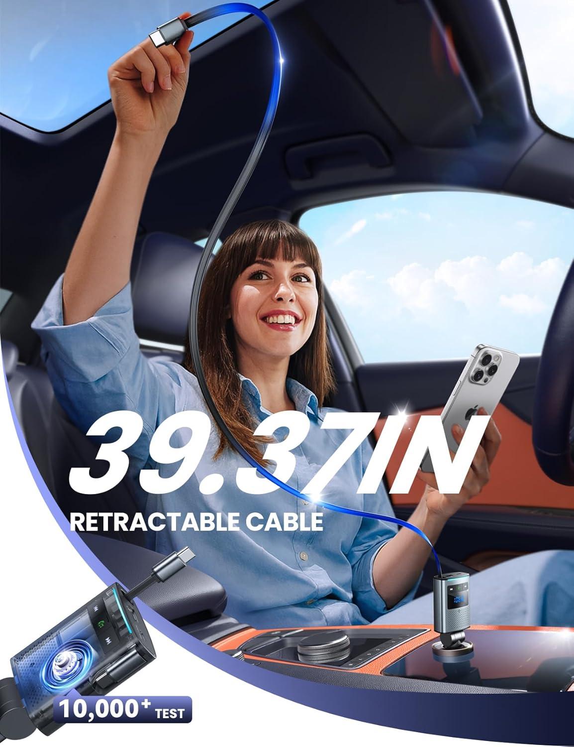 Retractable Bluetooth Car Charger: Enjoy the convenience of our retractable USB-C cables, adjustable up to 100cm in length. Perfect for fast charging laptops, tablets, and smartphones, they’re an ideal solution for travel and on-the-go use