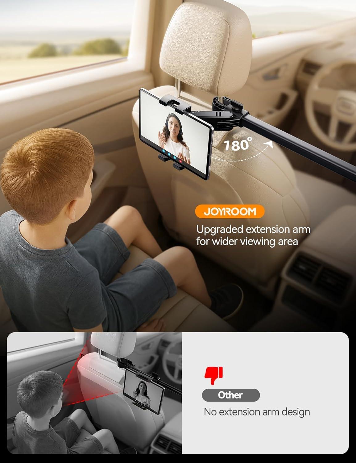 【2025 UPGRADE EXTENSION ARM DESIGN】Compared with other, JOYROOM car tablet holder adds an extension arm design to better adjust the viewing distance between passenger and device. The tablet holder can be adjusted left and right, with 360° rotation and 75° tilt, whether it is single or multiple passengers, this headrest mount will provide the best viewing position.
