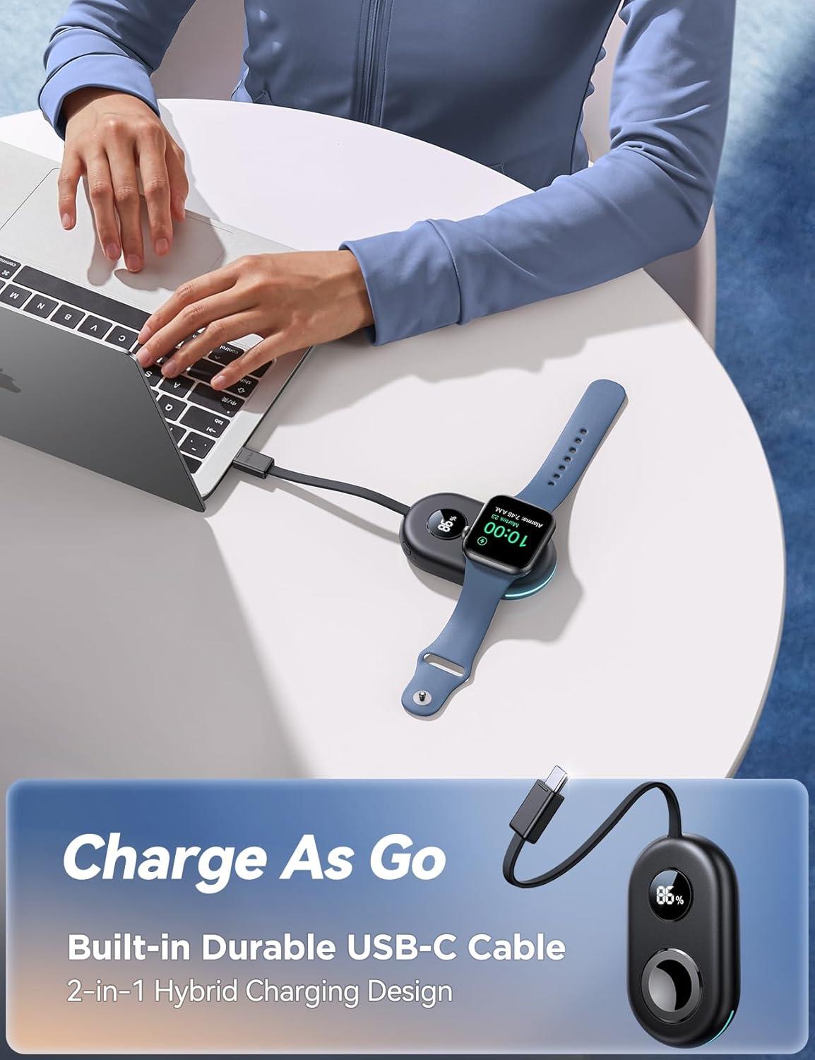 2500 mAh Pro iWatch Power Bank: JOYROOM Upgraded Magnetic Power Bank for Apple Watch Wireless Charging, Built-in 2500mAh battery offers 3~4 charges for iWatch Series 9~2, and 1.5~2 charges for iWatch Ultra Series (Maximize charging speed without compromising stability), which helps you no longer have to run around looking for a charging socket to charge your iWatch with Charging cable. Built-in 2-IN-1 Hybrid Input& Output USB-C Cable helps Recharge Power Bank to full within 2 hours