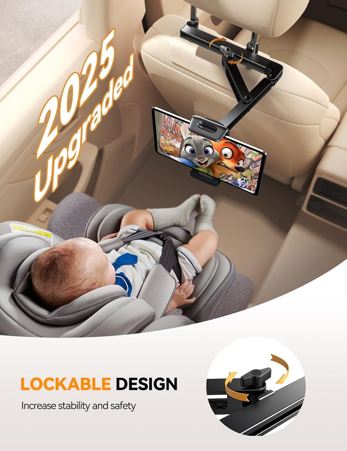 【Shockproof Protection & Safe Foldable Clasp】The ipad holder for car soft rubber lining protects your devices from friction, the telescoping arms can effectively prevent vibration while firmly grasping your rear seat and devices. Its foldable design lays flat and locks when not in use, preventing protruding hazards in your backseat tablet mount setup.