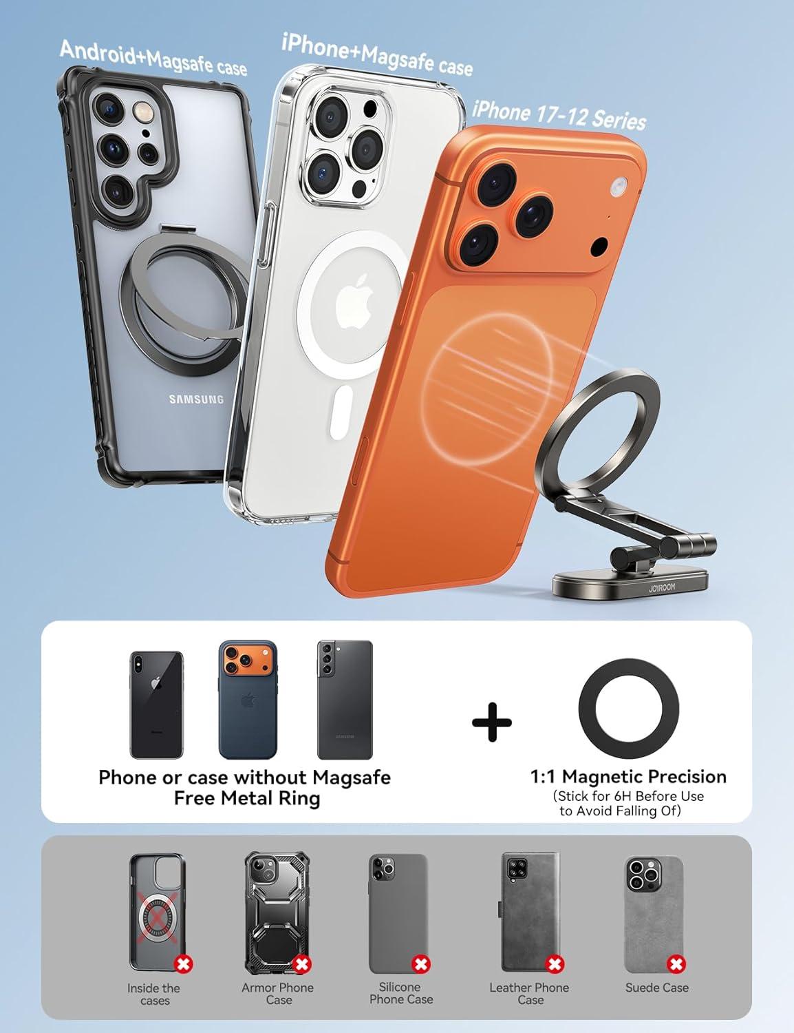WIDE COMPATIBILITY: Joyroom golf phone holder can attach directly to iPhone 17 16 15 14 13 12 series and is compatible with Magsafe case. Additionally, it also works with non-magnetic phones and standard phone cases with a metal ring (included in the package) on their back.【The back of the metal ring features 3M adhesive material, which is incompatible with silicone, textile, rugged or leather case. Additionally, the metal ring cannot be placed inside the phone case for use】